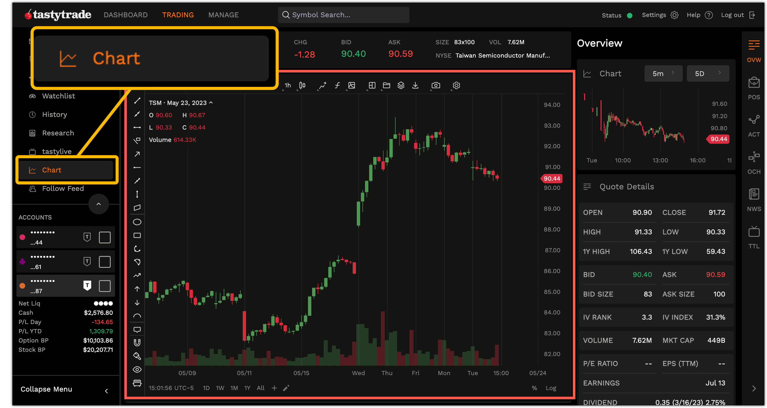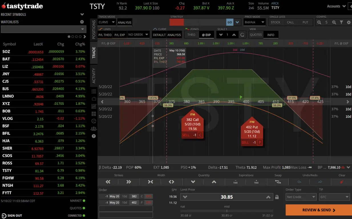 Tastytrade staví celý zážitek kolem opcí – přehledné zadávání multi-leg strategií, vizualizace profit/loss a spousta edukačního obsahu.